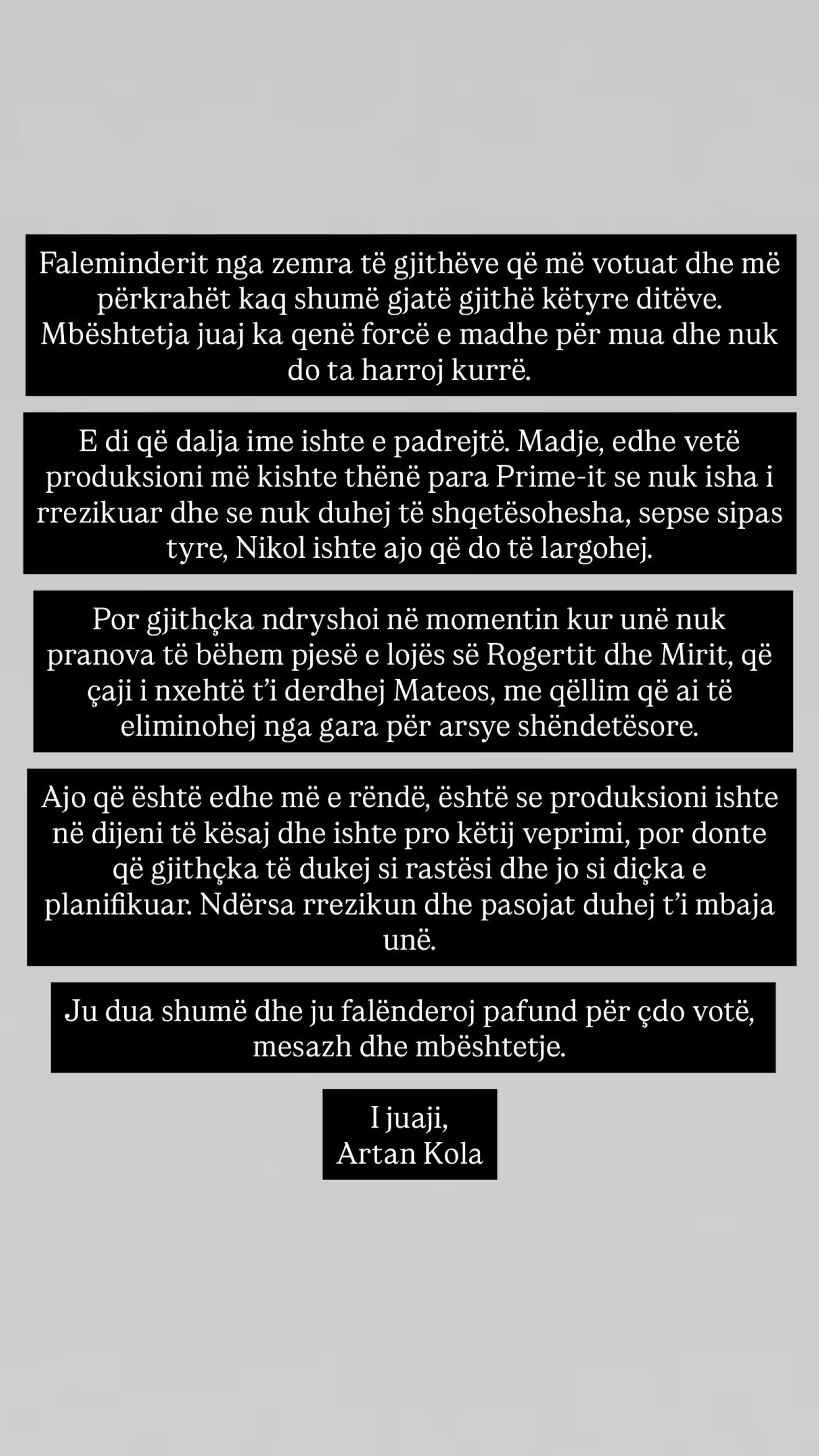 Në fund të reagimit të tij, Artan Kola zgjedh të falënderojë edhe një herë publikun, duke treguar se pavarësisht zhgënjimit, mbështetja e ndjekësve ka qenë shumë e rëndësishme për të. “Ju dua dhe falenderoj pa mase i juaji Artan Kola”, mbyllet deklarata e tij.