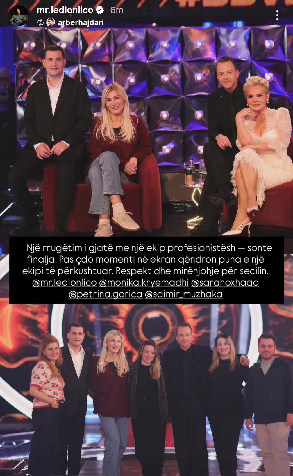 Për të treguar mirënjohjen e tij për këtë eksperiencë dhe bashkëpunim të gjatë, Arbri ka shkruar:.”Një rrugëtim i gjatë me një ekip profesionistësh — sonte finalja. Pas çdo momenti në ekran qëndron puna e një ekipi të përkushtuar. Respekt dhe mirënjohje për secilin.”