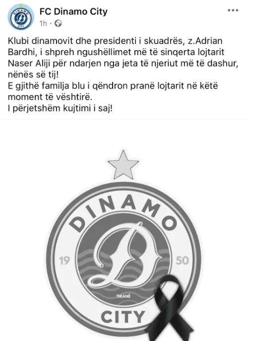 “Klubi dinamovit dhe presidenti i skuadrës, z.Adrian Bardhi, i shpreh ngushëllimet më të sinqerta lojtarit Naser Aliji për ndarjen nga jeta të njeriut më të dashur, nënës së tij!