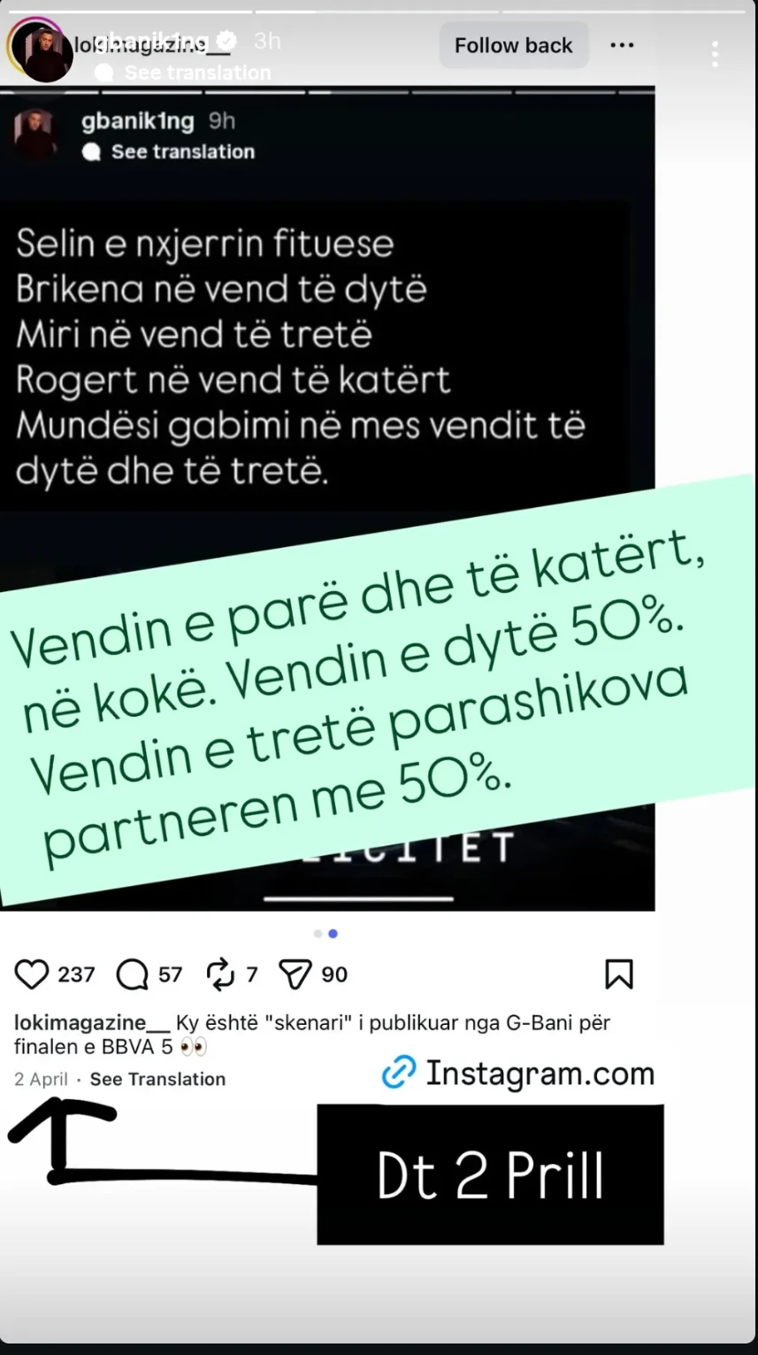 Për të mbështetur pretendimet e tij, G-Bani ka rishpërndarë një screenshot të një statusi të publikuar që në datën 2 Prill nga Loki Magazine, shumë kohë para finales.