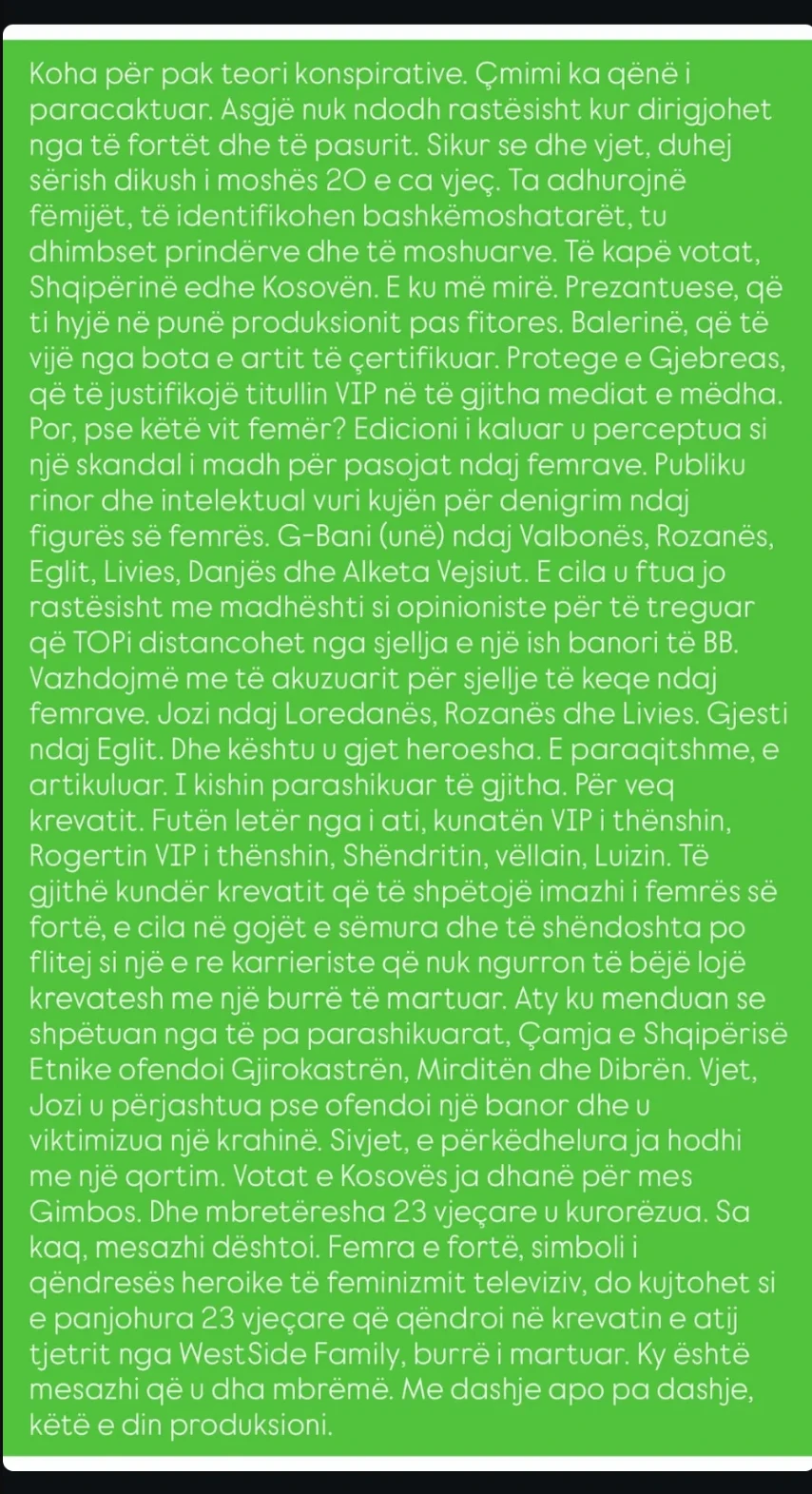 Por, ai nuk është ndalur me kaq. Përmes një teksti të gjatë të titulluar “koha për pak teori konspirative”, ish-banori ka bërë një analizë të ashpër të arsyeve që, sipas tij, shtynë produksionin ta shpallte Selinën fituese.