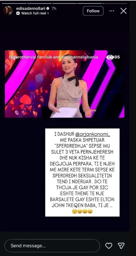 Në një shkrim të publikuar në Instagram Story, Edisa ka përdorur tone ironike dhe akuza personale ndaj opinionistit. Ajo shprehet: