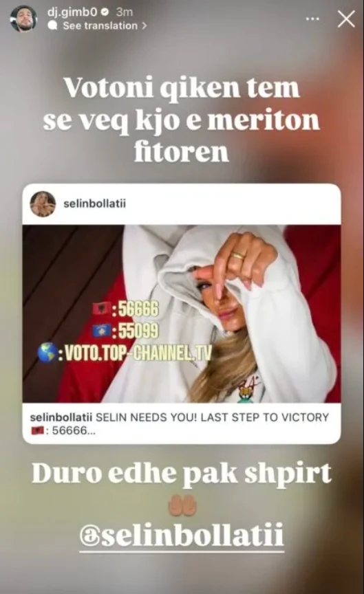 Ai ka bërë një postim në “Instastory” ku u ka bërë thirrje të gjithëve që të mbështesin finalisten që të shpallet fituese e këtij edicioni të pestë të reality showt.