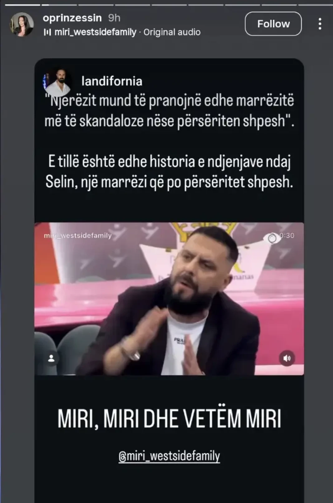 “Njerëzit mund të pranojnë edhe marrëzitë më të skandaloze nëse përsëriten shpesh. E tillë është edhe historia e ndjenjave ndaj Selin, një marrëzi që po përsëritet shpesh. MIRI, MIRI DHE VETËM MIRI,” – shkruhej në postimin e rishpërndarë.