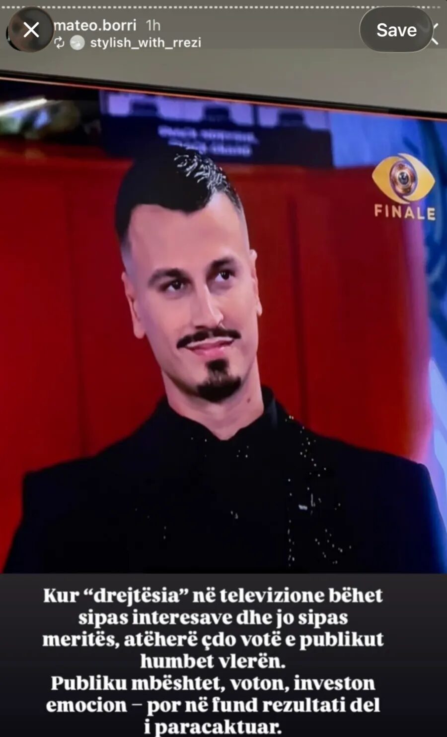 Mbi një foto të tijën të shkëputur nga finalja, ai shkruan: “Kur ‘drejtësia’ në televizione bëhet sipas interesave dhe jo sipas meritës, atëherë çdo votë e publikut humbet vlerën. Publiku mbështet, voton, investon emocion – por në fund rezultati del i paracaktuar.”