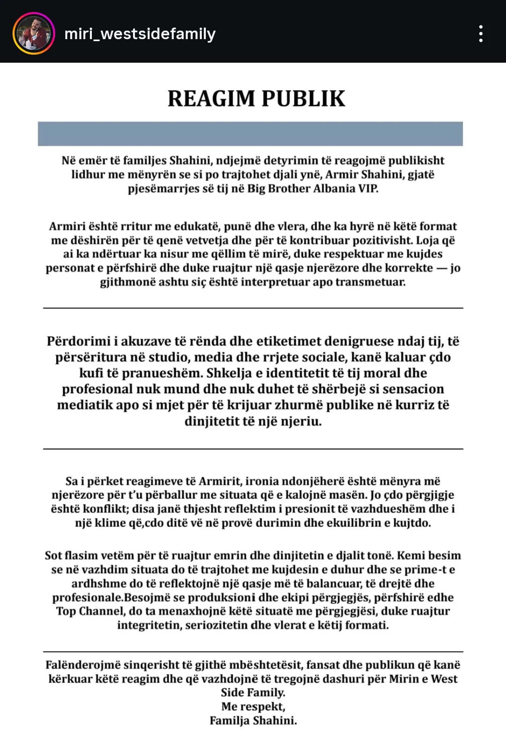 Situata e Armir Shahinit (Mirit) brenda shtëpisë së “Big Brother VIP Albania” dhe debatet e fundit që e kanë përfshirë atë, kanë detyruar familjen e tij të mbajë një qëndrim zyrtar.