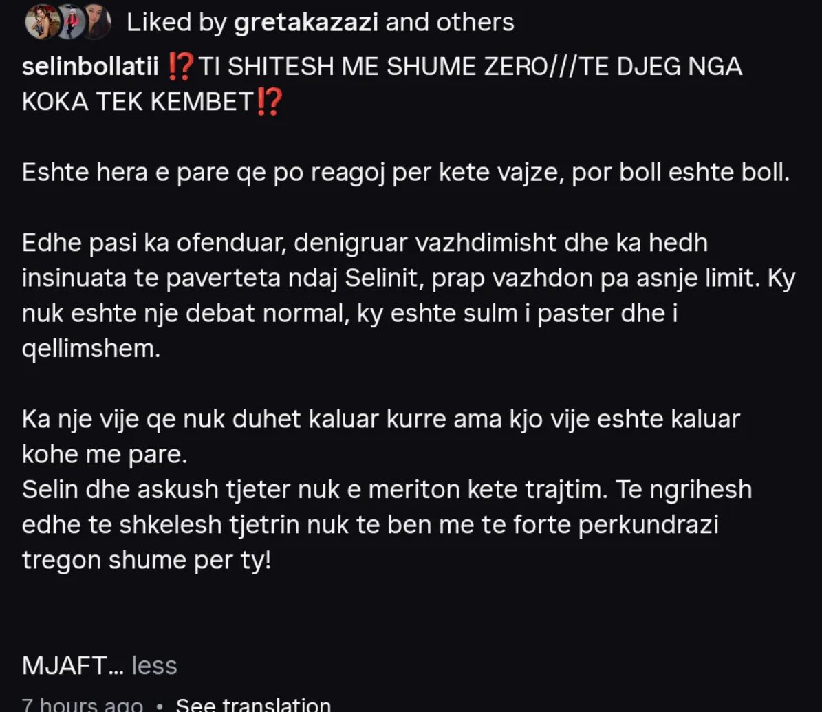 “!? TI SHITESH ME SHUMË ZERO///TË DJEG NGA ΚΟΚΑ ΤΕΚ ΚËMBËT!? Është hera e parë që po reagoj për këtë vajzë, por boll është boll. Edhe pasi ka ofenduar, denigruar vazhdimisht dhe ka hedh insinuata të pavërteta ndaj Selinit, prap vazhdon pa asnjë limit. Ky nuk është një debat normal, ky është sulm i pastër dhe i qëllimshëm. Ka një vijë që nuk duhet kaluar kurrë ama kjo vijë është kaluar kohë më parë. Selin dhe askush tjetër nuk e meriton këtë trajtim. Të ngrihesh edhe të shkelësh tjetrin nuk të bën më të fortë përkundrazi tregon shumë për ty! MJAFT”