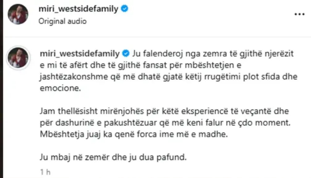 Në mesazhin e tij të ndjerë, anëtari i West Side Family shkruan: “Ju falënderoj nga zemra të gjithë njerëzit e mi të afërt dhe të gjithë fansat për mbështetjen e jashtëzakonshme që më dhatë gjatë këtij rrugëtimi plot sfida dhe emocione. Jam thellësisht mirënjohës për këtë eksperiencë të veçantë dhe për dashurinë e pakushtëzuar që më keni falur në çdo moment. Mbështetja juaj ka qenë forca ime më e madhe.”