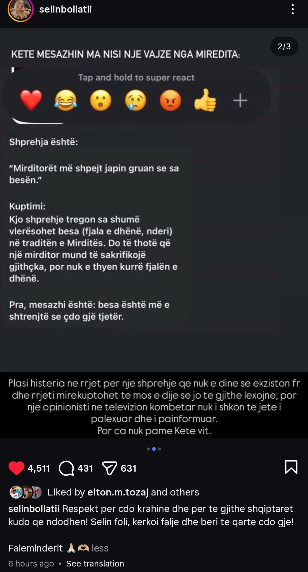 Në përshkrimin e këtij postimi, familja ka përcjellë një mesazh respekti: “Respekt për çdo krahinë dhe për të gjithë shqiptarët kudo që ndodhen! Selin foli, kërkoi falje dhe bëri të qartë çdo gjë! Faleminderit.”