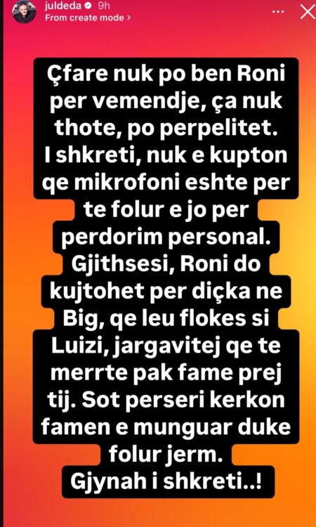 Deklarata e tij nuk ka kaluar pa reagim nga ana e Jul Dedës. Përmes një postimi ironik në InstaStory, aktori i është përgjigjur Ronaldos me tone thumbuese, duke shkruar se e vetmja gjë për të cilën do të mbahet mend ai, është që “leu flokët si Luizi” dhe që “jargavitej” për të kapur pak famë.![]()