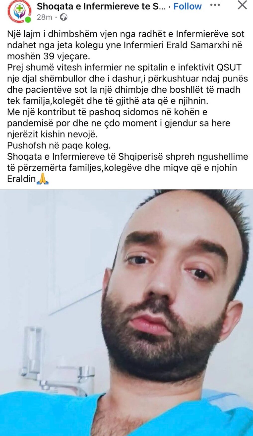 Është ndarë papritur nga jeta infermieri i spitalit të infektivit në QSUT, Erald Samarxhi. Një infermier i përkushtuar edhe në periudhën pandemisë, ikja para kohe e Eraldit, në moshën 39 vjeç ka lënë dhimbje e boshllëk të madh te familja, të afërmit, kolegët e të giithë ata të cilët e kishin njohur. Lajmi i trishtë u bë publik nga Shoqata e Infermierëve të Shqipërisë përmes një njoftimi në rrjetet sociale.