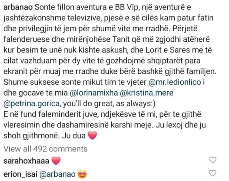 “Shumë suksese sonte mikut tim të vjetër @mr.ledionlico dhe gocave të mia @lorinamixha @kristina.mere @petrina.gorica, you’ll do great, as always”.