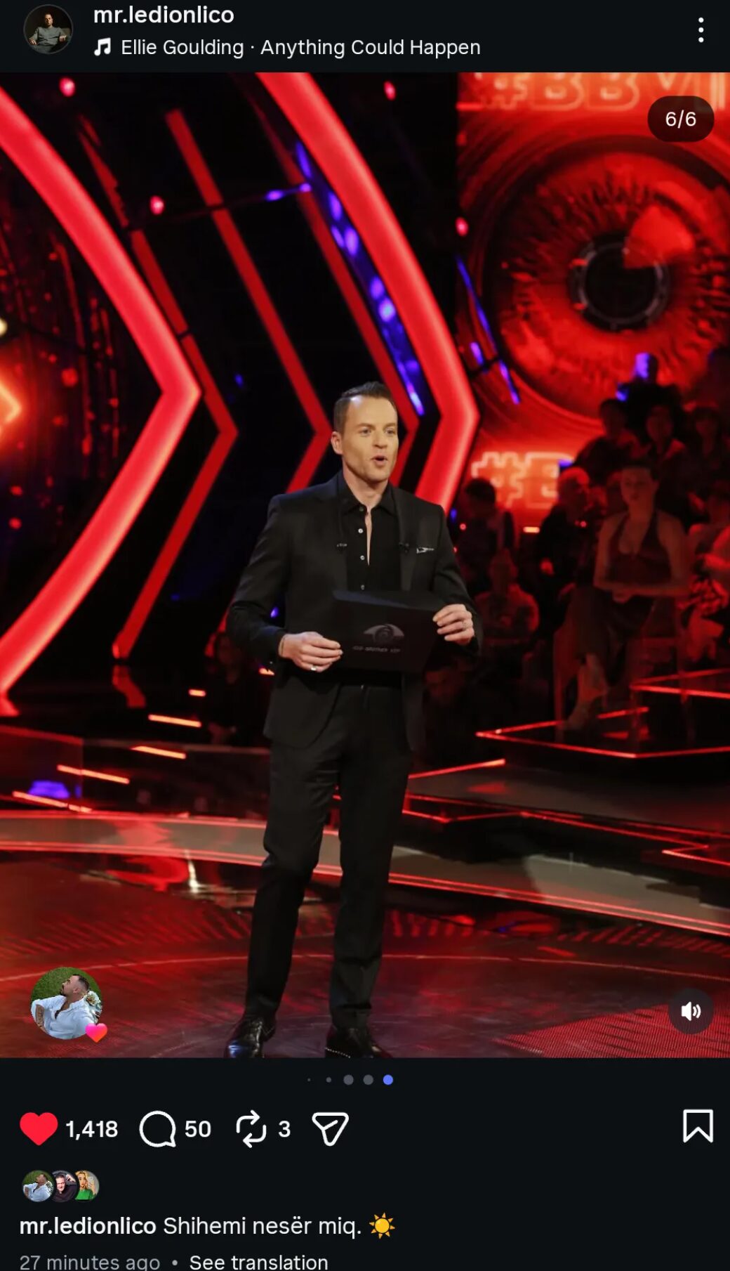 Përmes një karuseli me foto, Ledioni i ftoi ndjekësit të bëhen gati për Prime-in me mbishkrimin e thjeshtë: “Shihemi nesër miq”. Por, ajo që ka “çmendur” fansat dhe ka ngritur një valë aludimesh ndodhet pikërisht në foton e fundit të galerisë.