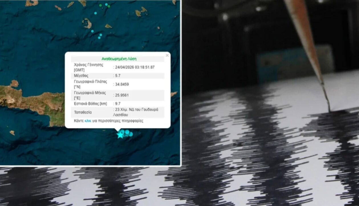 Një tërmet me magnitudë 5.7 të shkallës Rihter ka goditur mëngjesin e së premtes një zonë detare pranë Kretës, Greqi, duke u ndjerë fuqishëm në jug të ishullit.