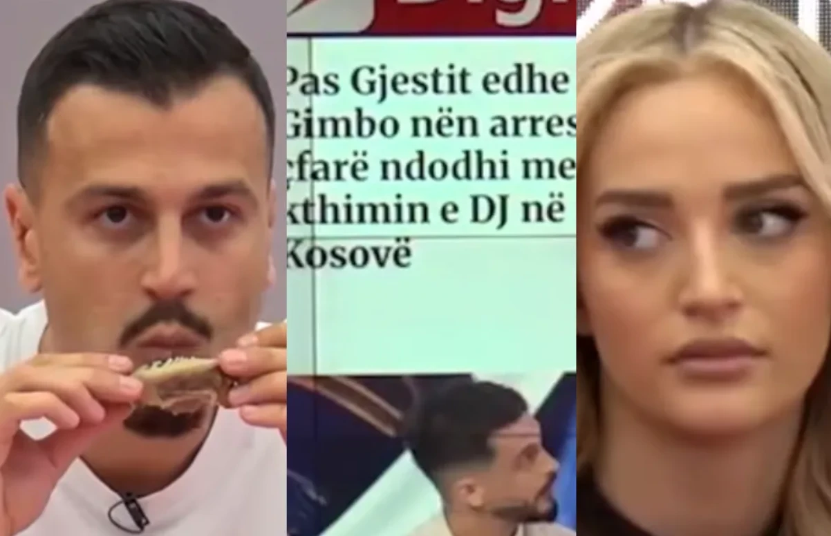 Në ekranin qendror të shtëpisë është shfaqur titulli: “Pas Gjestit edhe Gimbo në arrest? Ja çfarë ndodhi me kthimin e DJ në Kosovë”.
