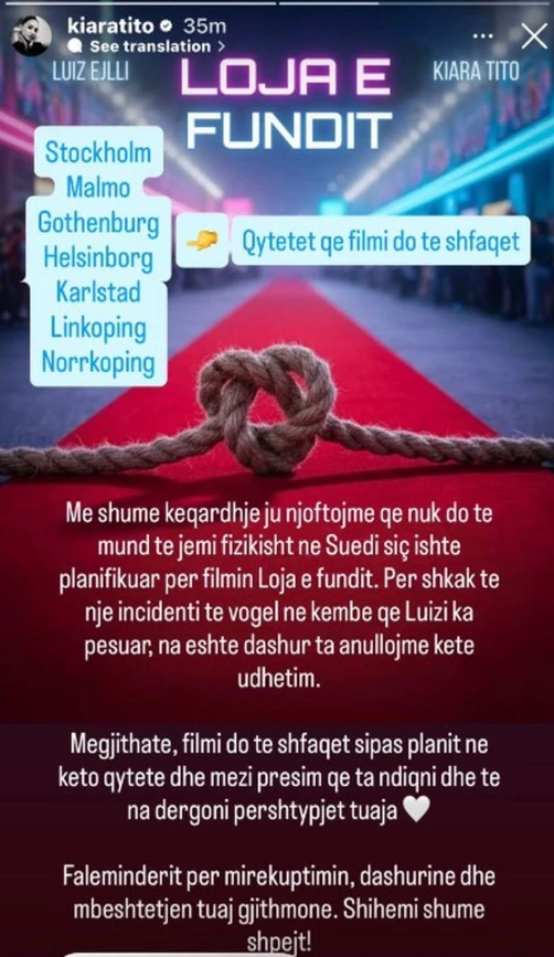 “Me shumë keqardhje ju njoftojmë se nuk mund të jemi fizikisht në Suedi, siç ishte planifikuar për filmin Loja e Fundit. Për shkak të një incidenti të vogël në këmbë që Luizi ka pësuar, na është dashur ta anulojmë këtë udhëtim,” shkruan Kiara në postimin e saj.