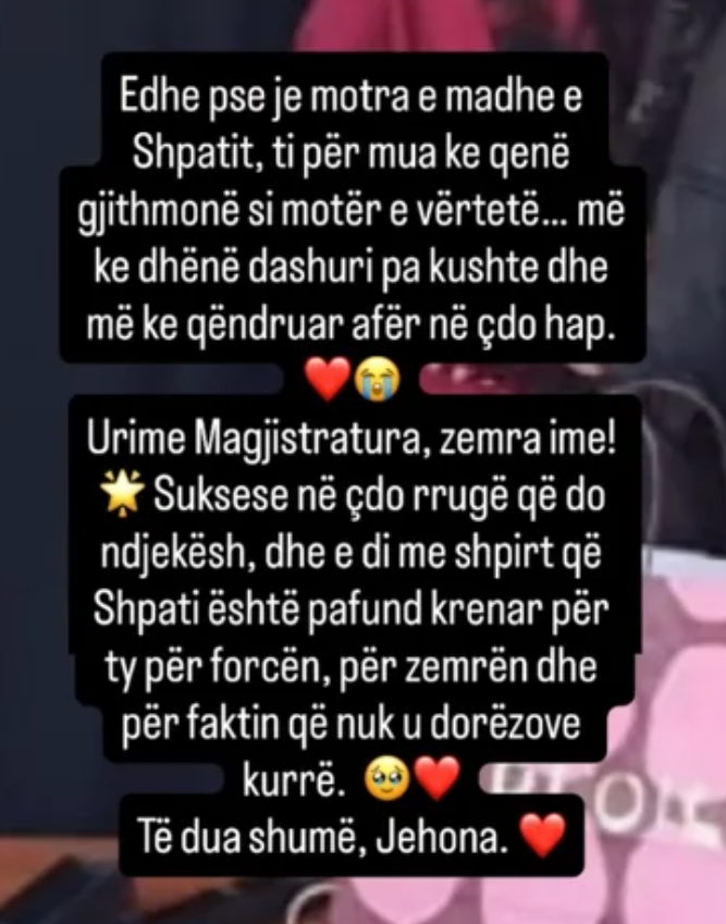 “Edhe pse je motra e madhe e Shpatit, ti për mua ke qenë gjithmonë si motër e vërtetë… më ke dhënë dashuri pa kushte dhe më ke qëndruar përkrah në çdo hap! Urime magjistratura zemra ime! Shpati është pafund krenar për ty, për forcën, për zemrën dhe për faktin që nuk u dorëzove kurrë. Të dua shumë, Jehonë.”