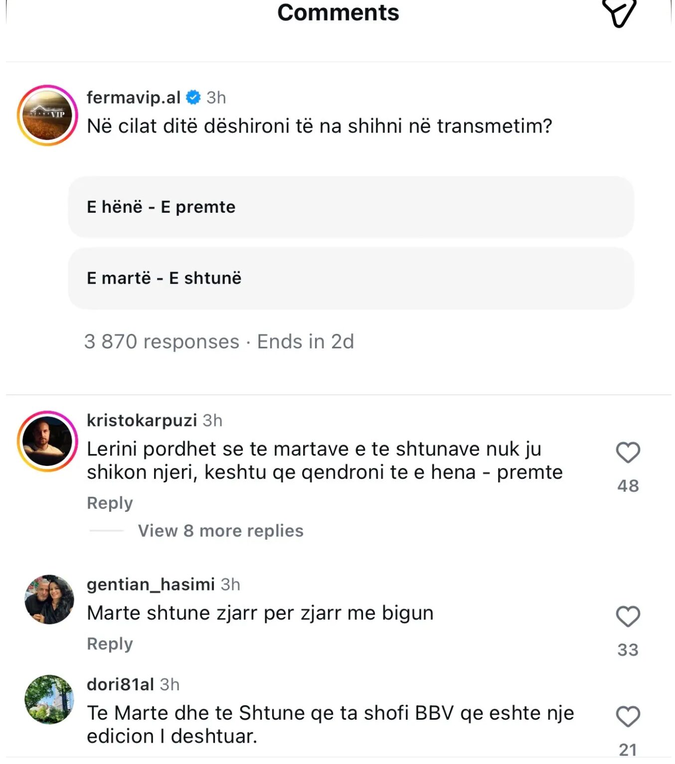 Sipas rezultateve të sondazhit, plot 66% e votuesve kanë zgjedhur opsionin “E hënë – E premte”, duke lënë alternativën e përballjes direkte me BBV në vetëm 34%.