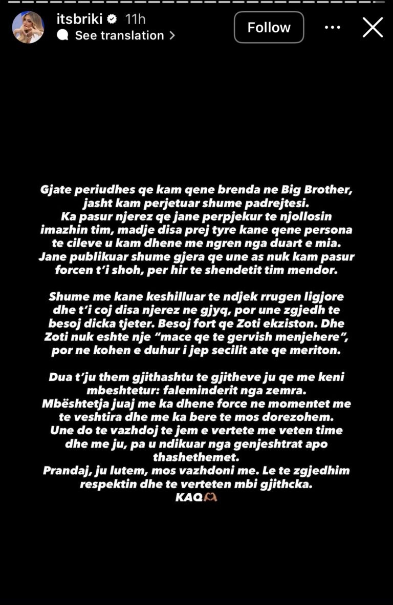 Pas përfundimit të rrugëtimit të saj në Big Brother VIP Albania, Brikena Selmani ka reaguar ashpër përmes një postimi të gjatë në Instagram, ku ka folur për përjetimet e saj brenda dhe jashtë shtëpisë.