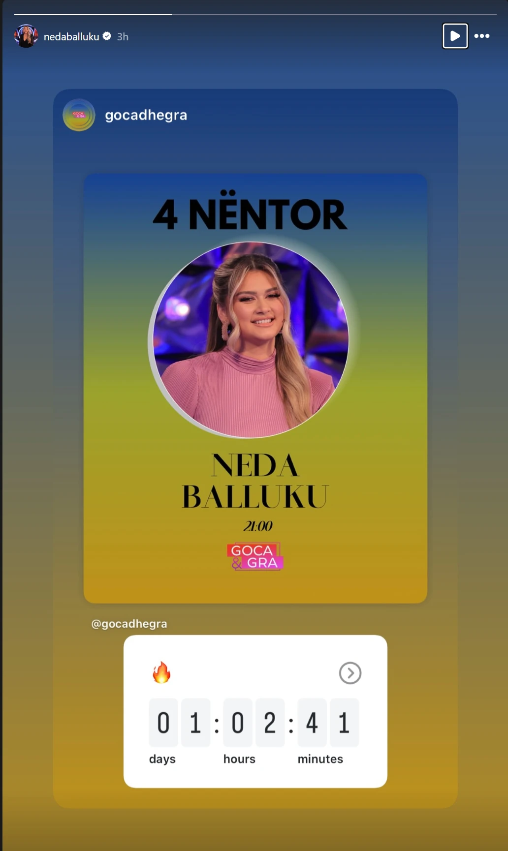 Nje postim ne instagramin e saj, Neda ka njoftuar se diten e neserme nga ora 21:00 do te jete e ftuar ne Goca Dhe Gra shkruan pp.hilsn.com.