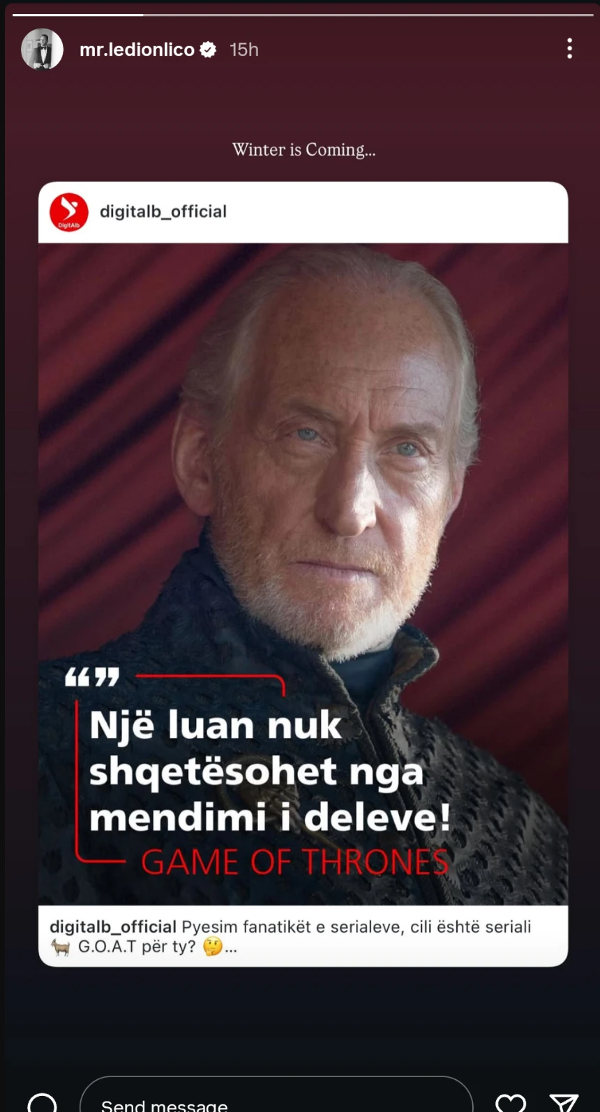 Për t’i dhënë fund aludimeve, Ledioni ka postuar në InstaStory thënien e njohur nga “Game of Thrones”: “Një luan nuk shqetësohet nga mendimi i deleve!” Ai e shoqëroi këtë citim me frazën: “Winter is Coming…” (Dimri po vjen…), e cila u interpretua edhe si paralajmërim për nisjen e edicionit të pestë të formatit.